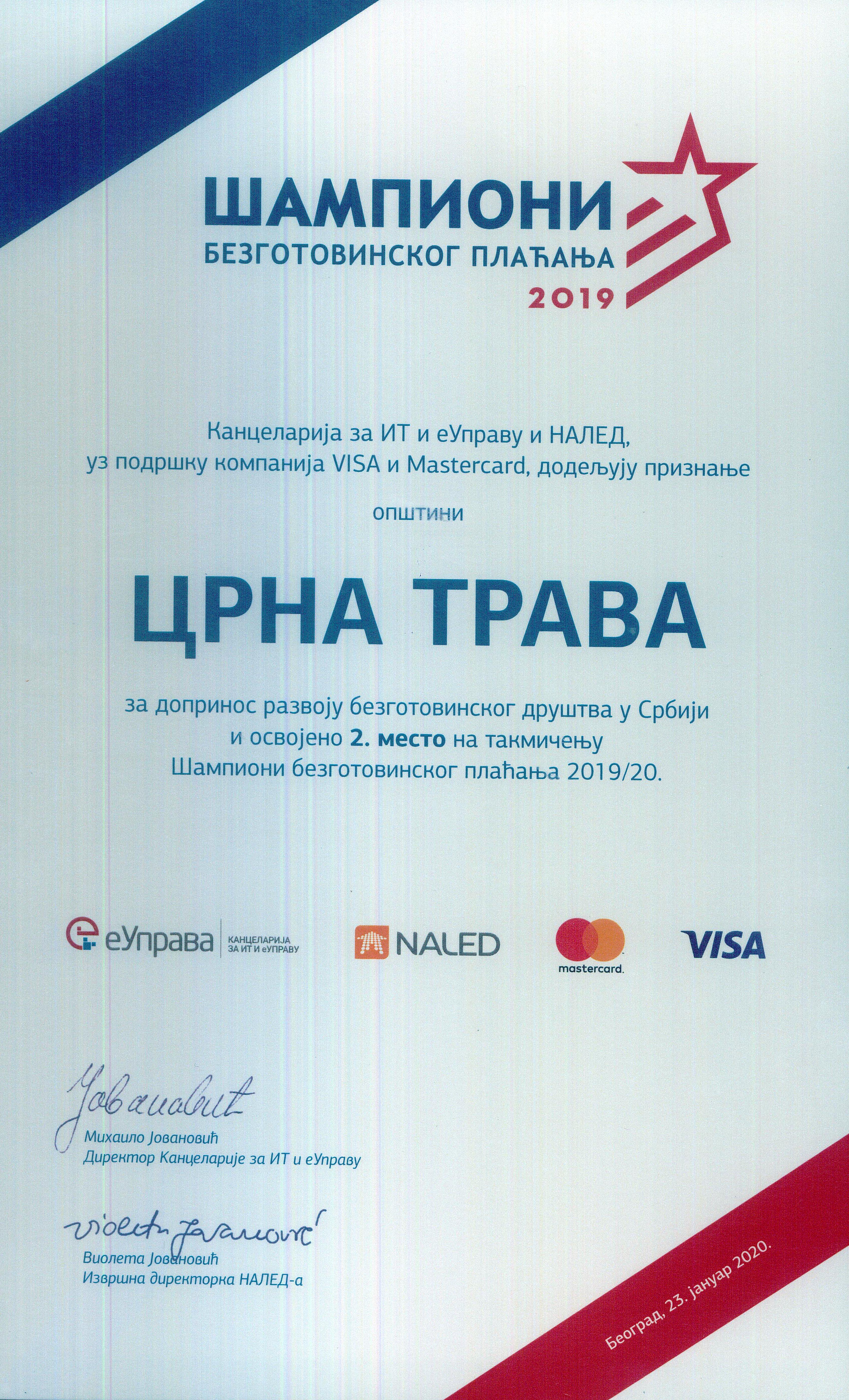23. јануар 2020. Црна Трава освојила друго место у такмичењу локалних самопурава „Шампиони безготовинског плаћања”